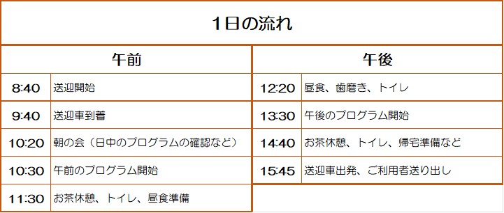 - 午前8時30分~午後5時15分(サービス提供時間は午前9時40分~午後15時45分)